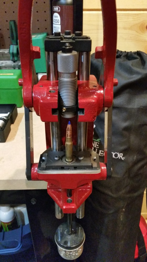 Pressing the bullet into the case
