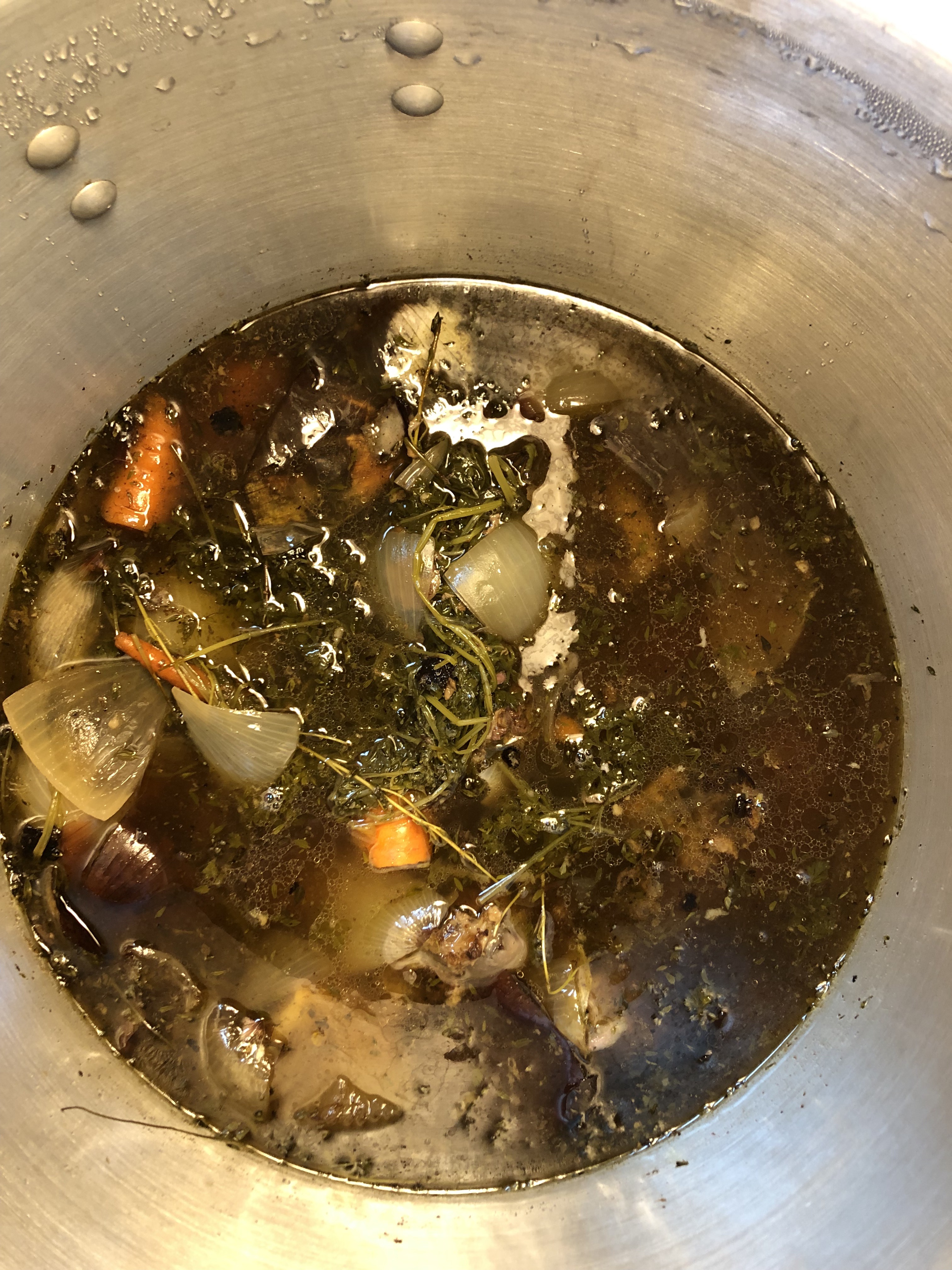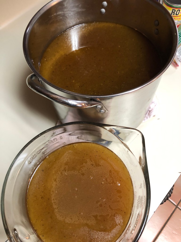 (10) Once reduced, I ladle the contents through a colander sitting in a fine mesh sieve sitting in a pot used to catch the strained liquid. Many people further strain the mixture through a paper towel, but I’m good with mine having a small amount of sediment in it.
