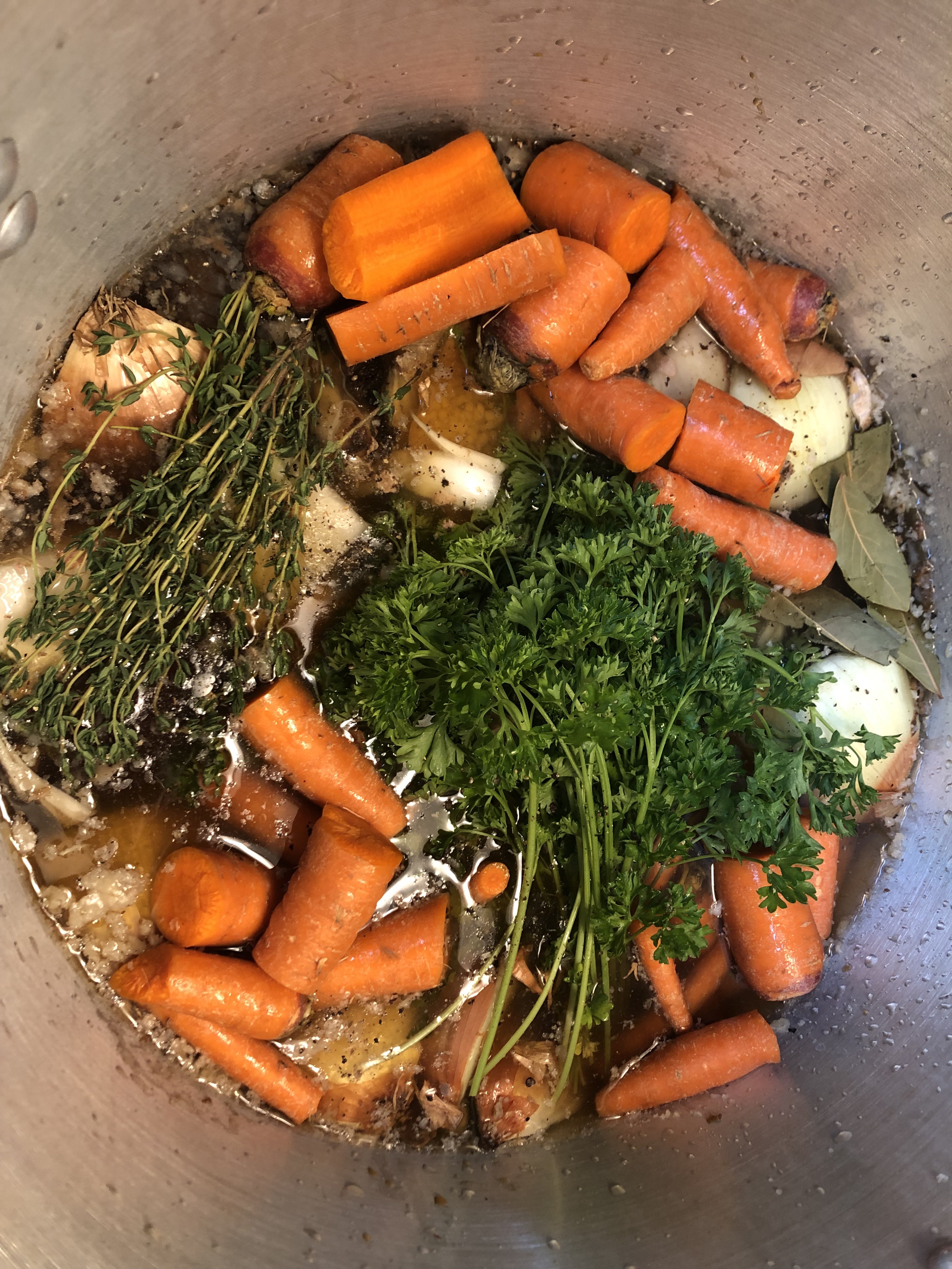 (6) Its “everybody in the pool.” Add your veggies along with the remaining drippings, and bones to the stock pot. What veggies? I thought you’d never ask: